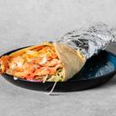 Kylling kjøtt i rull med salat, mais, løk, tomat, agurk og saus. Velg styrke.