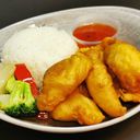 7 innbakte kyllingbiter, serveres med grønnsaker, ris og sweetchili saus.