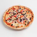 Pizza med tomatsaus, skinke, kylling, bacon, pepperoni og parmesan. Velg størrelse.