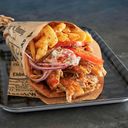 Gresk pitabrød med valgfritt kjøtt, løk, tomat og pommes frites. Serveres med ekstra fries, valgfri saus og drikke.