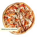 Pizza med pizzasaus, mozzarellaost, skinke, pepperoni, marinert biff, løk, champignon og paprika. Velg størrelse.