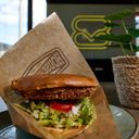 Burger med salat, chili mayo, cheese, paprika, rødløk, sjampinjong og peppersaus med naturli' vegetar patty.