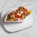 Kebabkjøtt med pasta, salat, tomat, rødløk, mais og dressing. Velg mellom kyllingkjøtt eller kebabkjøtt. Velg styrke på dressing.