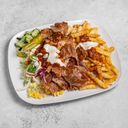 Kebabtallerken med pommes frites, salat, mais, tomat, rødløk og dressing. Velg mellom kyllingkjøtt eller kebabkjøtt. Velg styrke på dressing.