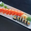 Anbefalt for 3-4 personer. 16 nigiri: 8 laks, 2 kveite, 2 tunfisk, 2 scampi, 2 kamskjell. 24 biter maki: 8 tempura, 8 sakura, 8 kokt scampi.