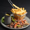 150g biff strimler, med stekt sjampinjong, rødløk og paprika. Serveres med en sidesalat, pommes frites og bearnaise saus.