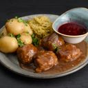 Hjemmelagede kjøttkaker på storfe kjøtt, med ertestuing, poteter og tyttebær.