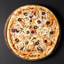 Pizza med oliven, ananas, løk, paprika og sopp.