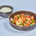 A one-pot meal packed with flavour from aromatic dark Thai chili sauce, filet of chicken, beef, scampi and scallop with chili pepper and selected vegetables.