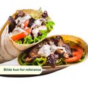 Rullekebab med kjøtt, salat, tomat, agurk, mais og løk rullet i hjemmelaget brød. Velg mellom hvitløksaus eller chilisaus.
