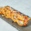 Fritert maki med fritert scampi, avokado, teriyakisaus og chilimayo.