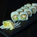 12 biter maki med krabbemiks, fritert scampi, avokado, ost, chilimajones og teriyakisaus.