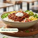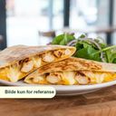 Serveres med ris eller salat, edamame, guacamole, mais, salsa og rømmedressing.