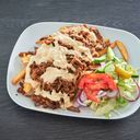 Tomatsaus, ost, storfekjøtt, kebabsaus og pommes frites.