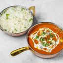Grillet kylling stekes i masala saus med fløte, paprika, løk, hvitløk, tomat, ingefær og krydder. Toppes med fersk koriander. Serveres med ris.