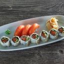 22 biter. 5 skiver laks sashimi, 1 tunfisk sashimi og 2 kamskjell sashimi. 3 biter laks nigiri, 1 tunfisk nigiri, 1 kveite nigiri og 1 kamsjell nigri. 8 biter scampi tempura maki serveres med salat, sjøtangsalat, kimchi, flyvefiskrogn, lakserogn og ponzusaus.
