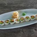 8 biter maki med fritert tempura scampi, avokado, flyvefiskrogn og ålsaus.