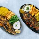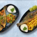 Flamme-grillet fisk servert med ris,pommes frites og salat. Serveres med yoghurt- og tahini saus. Perfekt for deg som vil ha litt av alt.