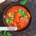 Tandoori røkt kylling tikka. Tilberedt i en kremet smør -og tomat karry med koriander. Serveres med ris.