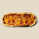 Porsjonspizza med surdeigsbunn, krydret tomatsaus, mozzarella, cheddar, rødløk og pepperoni.